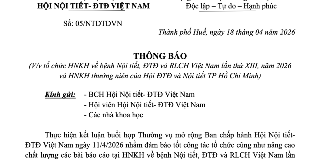 THÔNG BÁO SỐ 1 – HỘI NGHỊ KHOA HỌC VỀ BỆNH NỘI TIẾT, ĐÁI THÁO ĐƯỜNG VÀ RỐI LOẠN CHUYỂN HÓA VIỆT NAM LẦN THỨ XIII NĂM 2026 VÀ HỘI NGHỊ KHOA HỌC THƯỜNG NIÊN HỘI ĐÁI THÁO ĐƯỜNG – NỘI TIẾT THÀNH PHỐ HỒ CHÍ MINH NĂM 2026